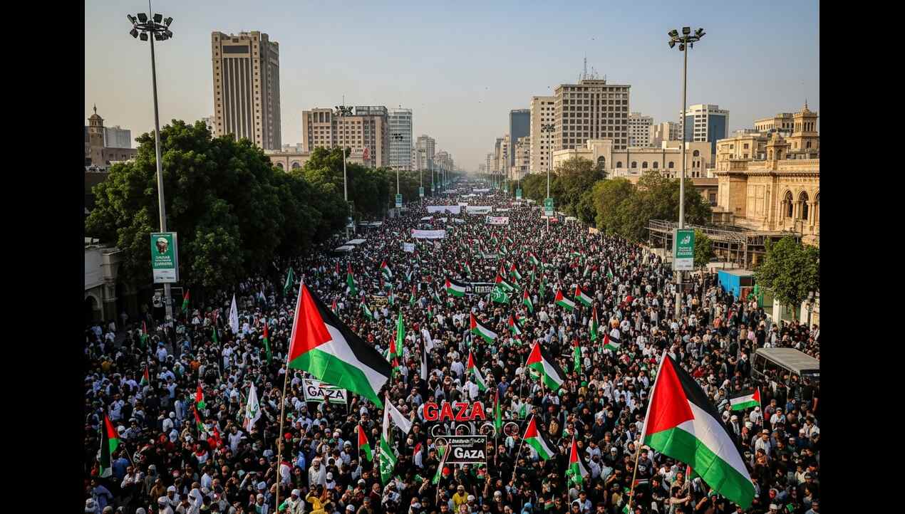 National News Thousands in Karachi March for Gaza, Demand Muslim Unity October 7, 2025 Thousands in Karachi March for Gaza, Demand Muslim Unity Thousand of people filled Sharea Faisal in Karachi on Sunday. Men,...